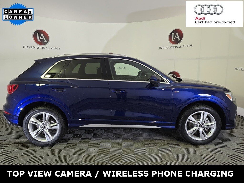 CARFAX One-Owner. Certified. Navarra Blue Metallic 2024 Audi Q3 Premium Plus S Line quattro quattro 8-Speed Automatic with Tiptronic 2.0L 4-Cylinder TFSI 10 Speakers, 19" Wheel Package, ABS brakes, Alloy wheels, Audi Advanced Key, Audi Beam-Rings, Audi smartphone interface (Apple CarPlay/Android Auto), Auto High-beam Headlights, Automatic temperature control, Convenience Package, Driver door bin, Driver Seat Memory, Electronic Stability Control, Exterior Parking Camera Rear, Heated door mirrors, Heated Front Bucket Seats, Leather Seating Surfaces, Leather Shift Knob, LED Interior Lighting Plus Package, Outside temperature display, Panic alarm, Power driver seat, Power Liftgate, Power moonroof: Panoramic, Premium Plus Package, Rain sensing wipers, Speed control, Top View Camera System, Wheels: 19" 5-Double-Spoke Dynamic Design, Wireless Phone Charging Pad.