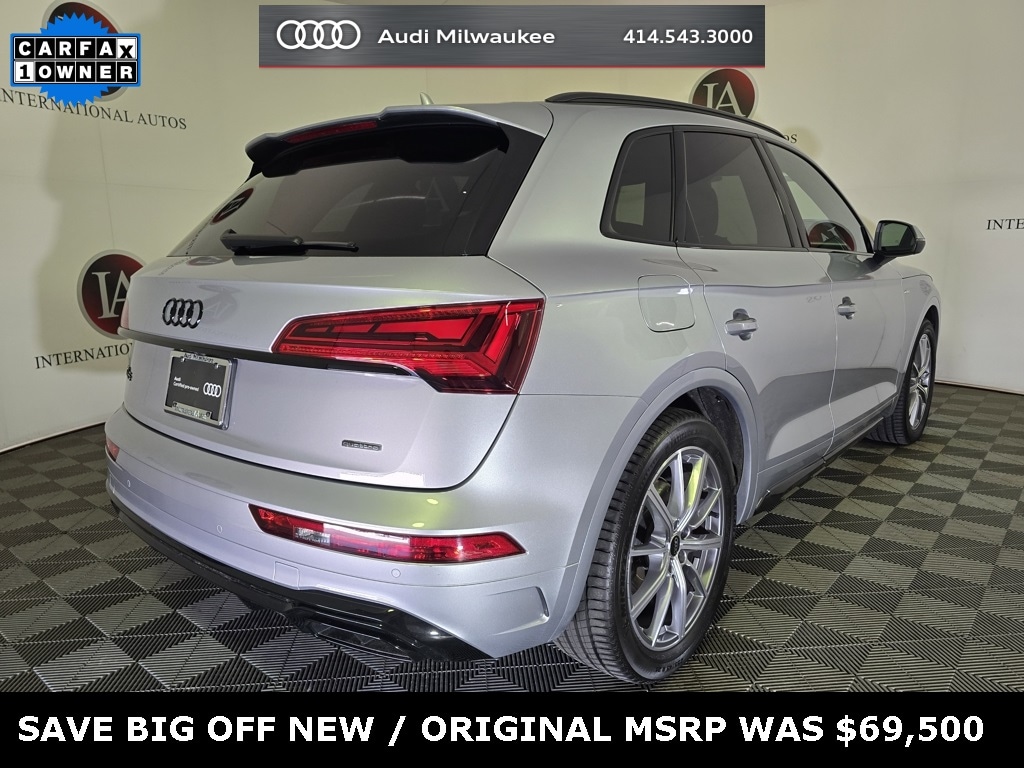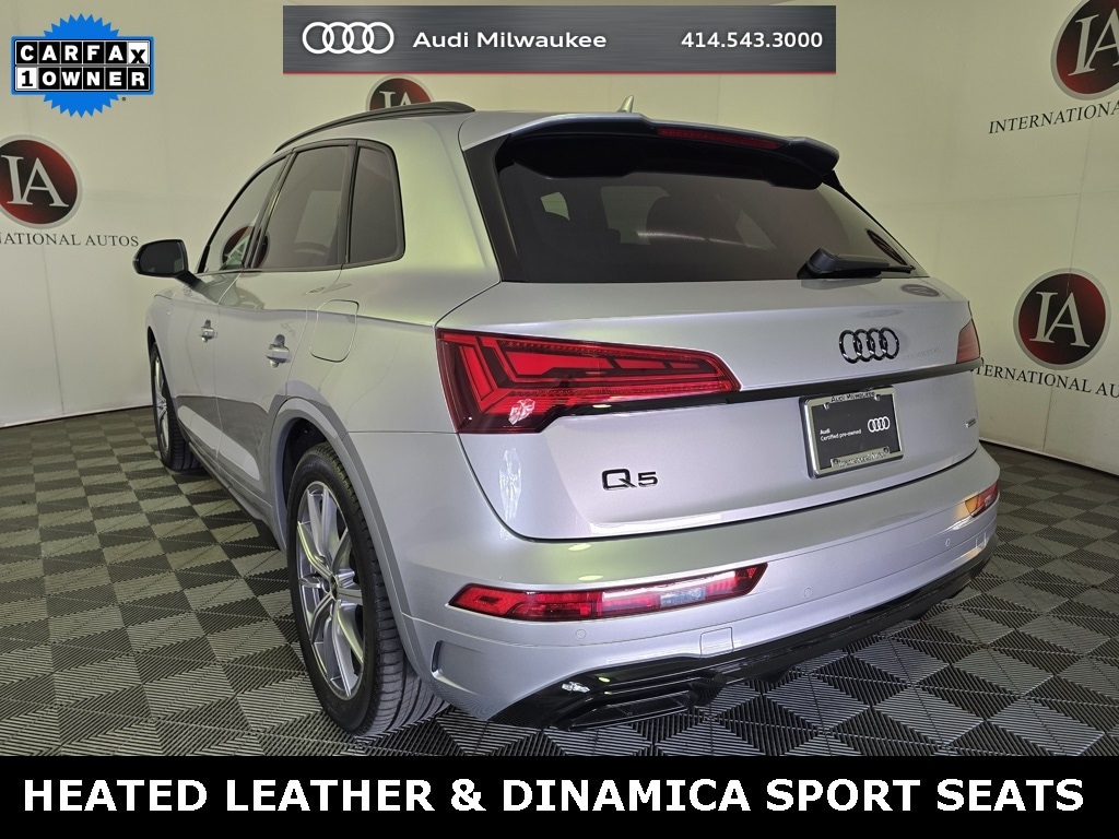 CARFAX One-Owner. Florett Silver Metallic 2024 Audi Q5 e 55 Premium Plus S Line quattro 7-Speed Automatic S tronic 2.0L Turbocharged ABS brakes, Active Cruise Control, Adaptive Air Suspension, Alloy wheels, Audi Advanced Key, Audi Beam-Rings, Auto High-beam Headlights, Bang & Olufsen Sound System w/3D Sound, Black Audi Rings & Model Badge, Black Exterior Trim, Black Headliner, Black Optic Plus Package, Black Roof Rails, Brushed Aluminum Inlays, Compass, Convenience Package, Deluxe Pre-Entry Climate Control, Driver Seat Memory, Electronic Stability Control, Exterior Parking Camera Rear, Front dual zone A/C, Heated 8-Way Power Front Seats, Heated door mirrors, Heated front seats, Heated steering wheel, High-Gloss Rear Diffusor/Front Spoiler/Air Intakes, Illuminated entry, Leather/Dinamica Seats, Low tire pressure warning, Outside temperature display, Panoramic Sunroof, Perforated Leather Steering Wheel w/S Badge, Power Adjustable Steering Column, Power Liftgate, Premium Plus Package, Rain sensing wipers, Red Brake Calipers, Remote keyless entry, Security system, Sport Plus Package for Premium Plus, Top View Camera System, Traction control, Wheels: 20" 10-Spoke-Star Design, Platinum Finish.